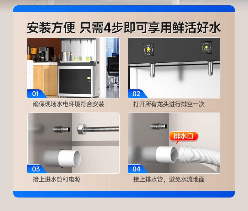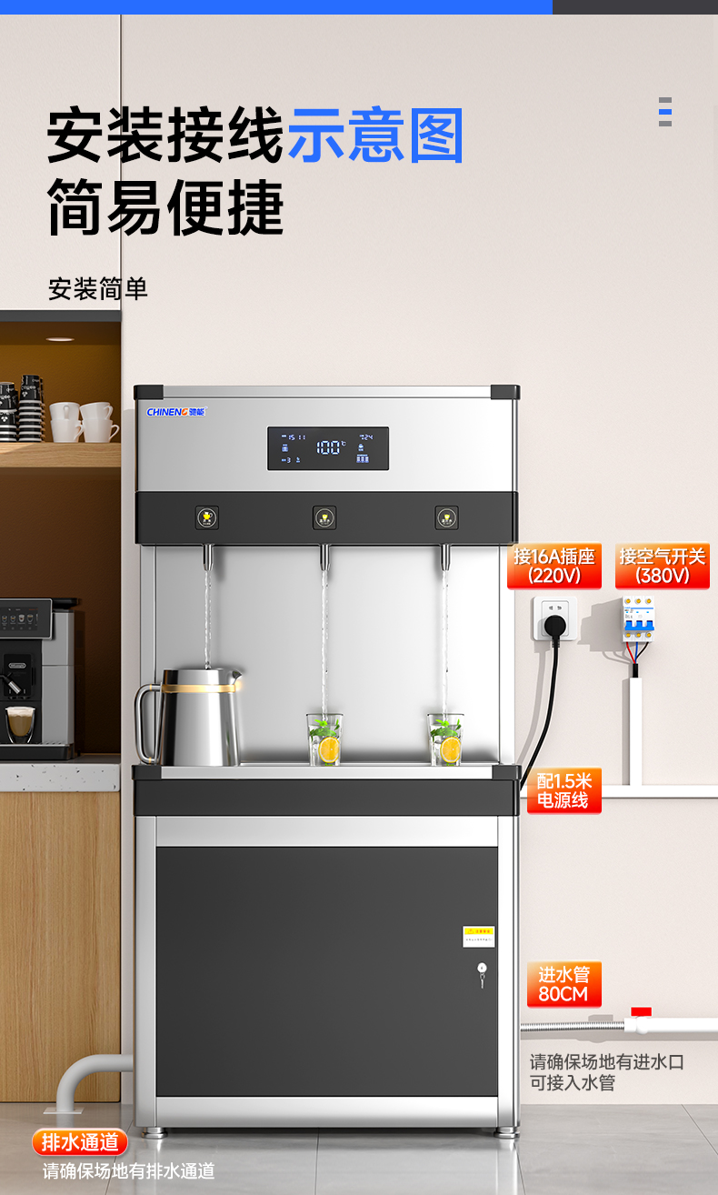 產(chǎn)水量:開水45L/h 溫開水250L/h